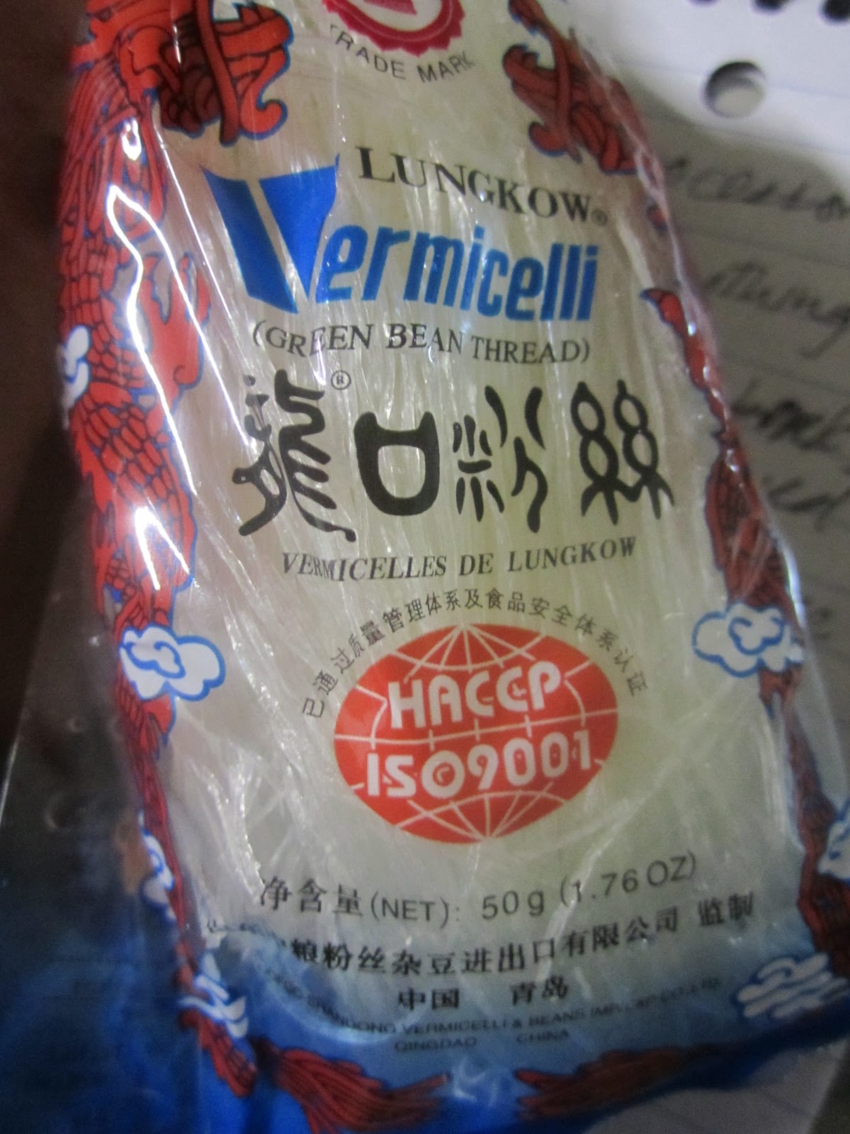 1. So, let's start with prepping the vermicelli. You want to soften the vermicelli (thin-white noodles) by soaking/washing it in room temperature water (or cold, whatever) for about five minutes. Dry in a colander. With scissors, cut the vermicelli into shorter strands.